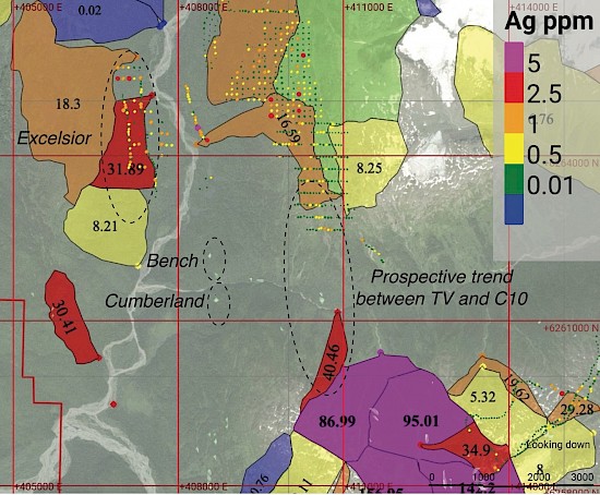 Figure 1: Gold BLEG map of the Excelsior region (color-coded polygons with results shown in ppb), also showing Ag results for soil samples (dots) collected during the 2021 and 2022 exploration programs. The Excelsior prospect is associated with a trend of strong BLEG anomalies and elevated Ag concentrations in soil samples. BLEG results suggest that the TV trend of VMS mineralization may continue southwards towards C10. Drilling and field exploration during 2021 and 2022 indicate that the Betty Creek Formation stratigraphy that hosts C10 and TV extends between the two showings.