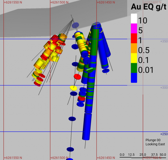 Figure 2: Cross-section view of Cumberland looking east showing assay results in Au equivalent (Au+Ag/78). Many of the mineralized drill holes terminate in Au mineralization. This, plus the possibility for stacked VMS mineralization not tested by the shallow drilling done at Cumberland so far, raises the possibility for additional discoveries at Cumberland.