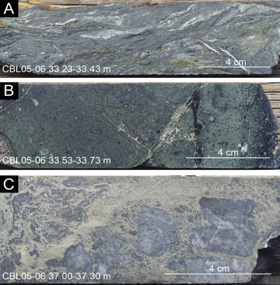 Figure 3: Mineralized drill core from drill hole CBL05-06 showing sulfide mineralization associated with the Willow Ridge basalt-Eskay rhyolite contact. Image A shows an intensely sheared carbonaceous mudstone with white bands of barite, a common alteration mineral associated with seafloor-hosted VMS mineralization. Image B shows hydrothermally altered Willow Ridge basalt less than 4 meters above the strongly replacement-style mineralization of Eskay rhyolite shown in image C.