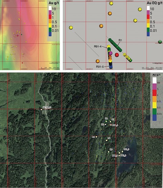Figure 5: Map view of the R-grid where rock chip sampling and drilling at Virginia Lakes was conducted in 1991. A cluster of auriferous rock chip samples is associated with a magnetic anomaly (top right). Drill results are shown as Au equivalent (Au+Ag/78), and yielded tens of meters of anomalous Au mineralization grading up to 1.824 g/t Au equivalent. The host rocks for this mineralization are reported as felsic breccia, and are likely to belong to the upper Hazelton Group. Field investigations planned for 2023 will return to this area for confirmation of the rock type, and to define the larger trend of mineralization associated with magnetic anomalies.