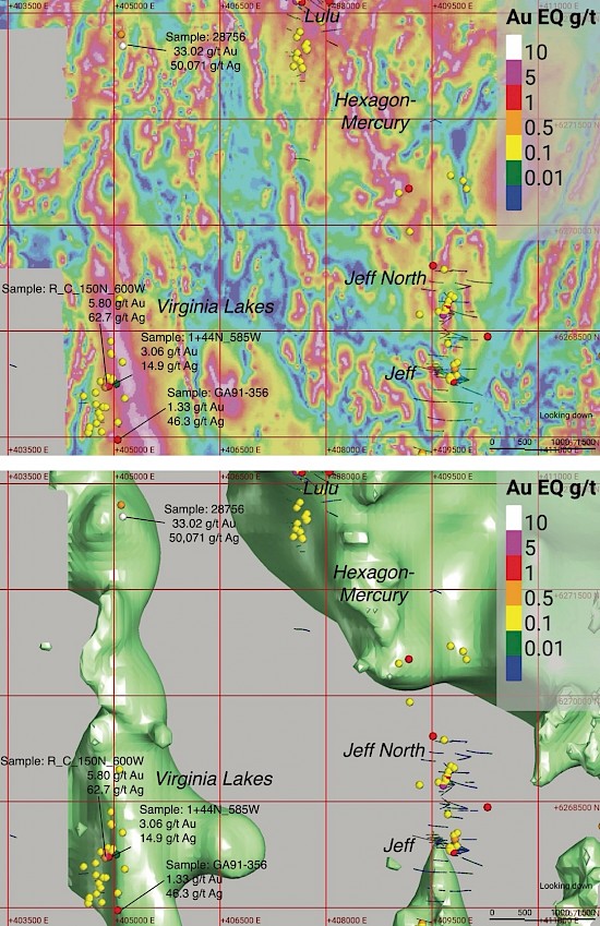 Figure 6: Maps showing magnetic tilt derivative data (top) and the modeled 0.001 SI 3D magnetic susceptibility surface for the Virginia Lakes area. The trend of Au- and Ag-bearing rock chip samples coincides with a pronounced magnetic anomaly. Of particular note is the pronounced magnetic susceptibility anomaly associated with rock chip sample 28756 that yielded 33.02 g/t Au and 50,071 g/t Ag (from Assessment Report 19,347).