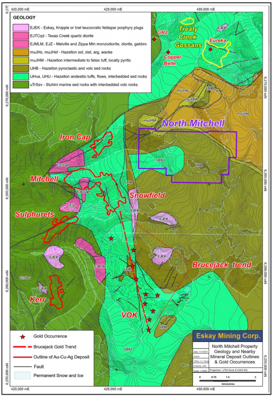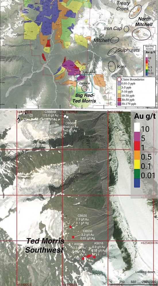 The North Mitchell and Ted Morris showings lie along a larger northeast-southwest trend of Cu-Au porphyry deposits that includes KSM, Iron Cap, and Treaty Creek (Figure 1) that comprise a total indicated Au resource of over 100 million ounces, and a Cu resource of over 20 billion pounds. Prospecting and BLEG surveys of North Mitchell, Big Red, and Ted Morris shows high Au and Cu concentrations associated with the chalcopyrite, bornite, and chalcocite. BLEG anomalies between Ted Morris and Kerr suggest that this area has widespread potential for Cu-Au porphyry deposits.