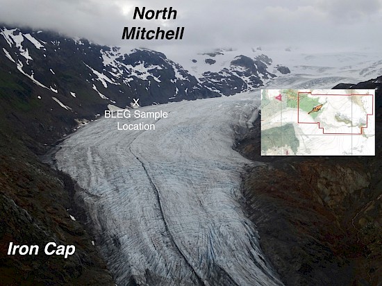 The North Mitchell claims cover 14.5 square kilometers adjacent to the KSM Cu-Au-Ag-Mo deposits and the Valley of the Kings gold deposit (Brucejack), and is 19 km southeast of the Eskay Creek precious metals-rich VMS deposit. Much of North Mitchell is steep and glaciated however there is considerable exposure north of Mitchell Glacier (Figure 5) where prospecting and BLEG sampling have been conducted. The southwestern part of North Mitchell hosts lower Hazelton Group andesites and associated sedimentary rocks (Figure 6), the same host rocks as the precious metal-endowed Valley of the Kings, Iron Cap, Mitchell, and Treaty Creek deposits. BLEG sampling shows a strong 27.64 ppb Au anomaly, from the single drainage that was able to be sampled in this rugged area. Prospecting of this area conducted in 2016 identified strongly anomalous Au, Ag, Cu, and Mo concentrations (Figures 7-10) associated with veins of quartz, chalcopyrite, and bornite. This mineralogy is consistent with porphyry-style mineralization.