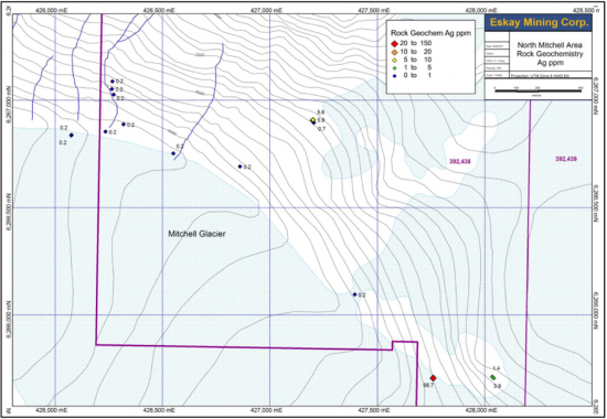 Figure 8: Results of Ag assays for rock chip samples from the 2016 prospecting program in the southwestern portion of the North Mitchell claims.