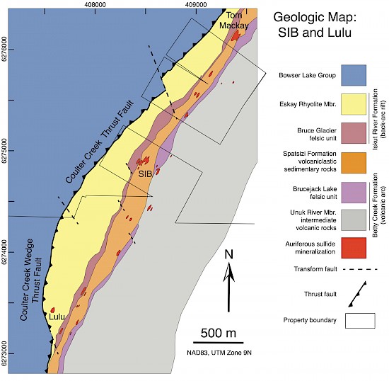 Figure 1: Simplified geologic map of the Sib and Lulu zones (modified from Lewis, 2013). VMS mineralization occurs at several stratigraphic levels within the Betty Creek and Iskut River Formations.