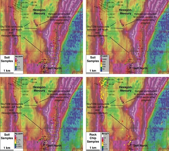 The Hexagon-Mercury Zone lies ~750 m to the southeast of the Lulu Zone, and extends towards Jeff North ~3 km southeast of the Lulu Zone (Figures 7 and 8). This zone is defined by an Eskay Creek-like magnetic anomaly (Figure 7), as well as a trend of stratiform conductors extending from Jeff North towards Hexagon-Mercury (Figure 8). Results from soil sampling in 2021 and 2022 show Ag, Zn, and Hg anomalies extending northwards along the east limb of the Eskay anticline (Figure 9). Legacy rock chip sample assays indicate the presence of Au along the trend of magnetic and conductive anomalies (Figures 7 and 8). Historic drilling at Hexagon-Mercury intercepted Betty Creek Formation-hosted sulfide mineralization with grades up to 8.08 g/t Au over 2 m in drill hole 03-127, as well as Hg values up to 100 ppm. Preparations were made in 2022 to access this rugged area for exploration during 2023.