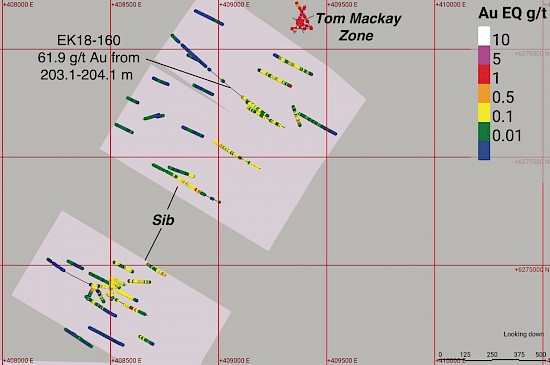Figure 2: Map view of the Sib zone showing drill hole assay results in Au equivalent (Au+Ag/78). Precious metal mineralization is predominately hosted by peperitic rhyolite in the upper part of the Spatsizi Formation, and extends to the Tom Mackay zone on Skeena Resources ground. The pink boxes show the boundaries of the Consolidated Eskay Property in this area. Drill hole EK18-160 intercepted 61.9 g/t Au over the interval 203.1-204.1 m.