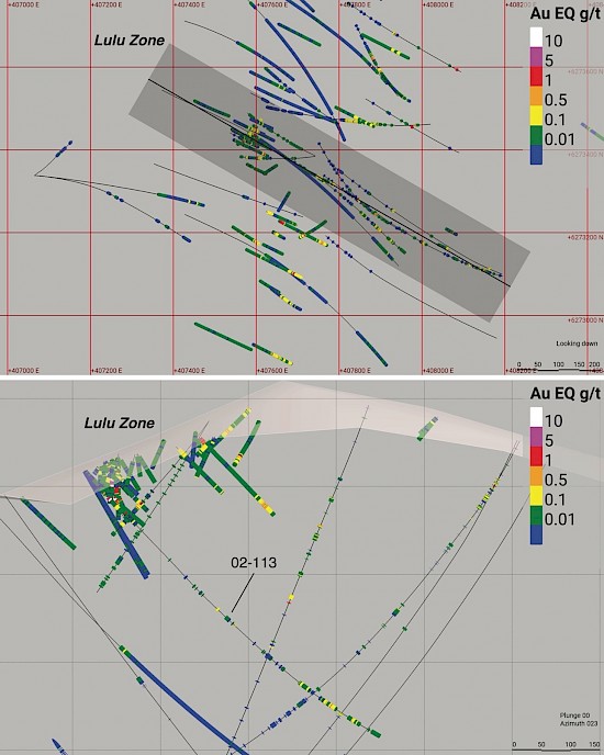 Figure 3: Map and cross-section views of the Lulu zone showing assay results in Au equivalent (Au+Ag/78).