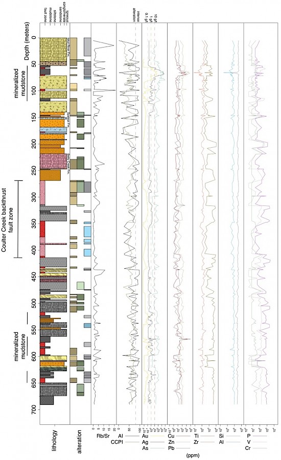 Figure 4: Core log with assays and select lithogeochemical data for drill hole 02-113 from the Lulu Zone. Gold and silver mineralization occurs at several stratigraphic levels, with the highest grades reported from mudstones within the Eskay rhyolite. Based on the stratigraphic position of this high-grade mineralization, it is likely the time equivalent horizon to the Lower Mudstone at the Eskay Creek deposit ~4 km to the northeast. Mineralization is closely associated with intense hydrothermal alteration as indicated by the high Ishikawa alteration index values (AI) occurring with high Au and Ag values.