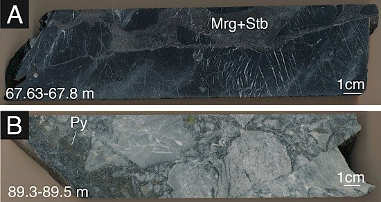 Figure 5: Samples from 02-113. A: Mineralized mudstone breccia with stibnite (Stb) and miargyrite (Mrg) filling space between mudstone fragments. B: Representative sample of peperitic rhyolite at lower contact with the overlying mineralized mudstone.