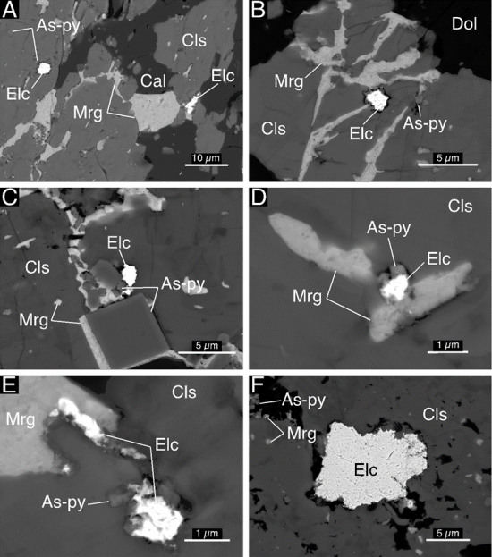 Figure 6: Back-scattered electron microscope images illustrating electrum replacement of the silver sulfosalt mineral miargyrite in sample 02-113 67.2 m. Electrum is the primary host mineral for Au in the Lulu Zone and at other VMS showings property-wide.
