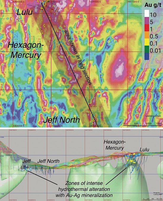 Figure 7: A 2 km thick vertical slice looking west at the Jeff North-Hexagon-Mercury target. The center line of the slice is oriented along an azimuth of 340 degrees, oblique to the UTM grid and rotated 20 degrees from the viewing plane. The light green volume shows the 0.001 SI magnetic susceptibility 3D model. Zones of intense hydrothermal alteration (an Ishikawa alteration index greater than 80) are modeled as light blue volumes. The area between Jeff North and Hexagon-Mercury hosts prospective magnetic anomalies that lie on trend with Au and Ag mineralization located by drilling and rock chip sampling.