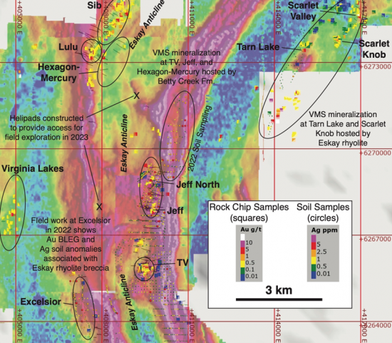 Figure 8: SkyTEM conductivity map of the central and southern Eskay anticline showing legacy rock chip Au concentrations (squares), and 2021-2022 soil sample Ag concentrations (circles). These data in combination with drilling along the TV-Jeff and the Eskay Creek-Sib-Hexagon-Mercury trends suggest that VMS systems occur within the Lower Hazelton Group along the length of the Eskay anticline. Soil sampling and prospecting at Excelsior in 2021-2022 show that Ag anomalism in soils and a Au BLEG anomaly is associated with Eskay rhyolite, suggesting VMS mineralization within the Upper Hazelton Group also extends well south of the Eskay Creek mine.