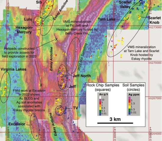 Figure 1: SkyTEM conductivity map of the central and southern Eskay anticline showing legacy rock chip Au concentrations (squares), and 2021-2022 soil sample Ag concentrations (circles). These data in combination with drilling along the TV-Jeff and the Eskay Creek-Sib-Hexagon-Mercury trends suggest that VMS systems occur within the Lower Hazelton Group along the length of the Eskay anticline. Soil sampling and prospecting at Excelsior in 2021-2022 show that Ag anomalism in soils and a Au BLEG anomaly is associated with Eskay rhyolite, suggesting VMS mineralization within the Upper Hazelton Group also extends well south of the Eskay Creek mine.