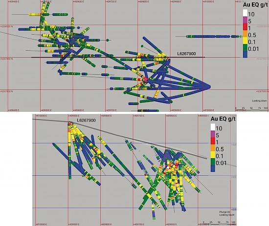 Figure 8: Map and cross-section views of Jeff showing drill hole assay results. Drill core assays are shown in g/t Au equivalent (Au+Ag/78). The bottom image shows a 100 m thick cross-section looking south centered on line 6267900 N.
