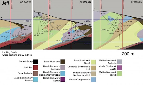 Figure 9: Geological cross-sections of the mineralized zones at Jeff. Mineralization is hosted by