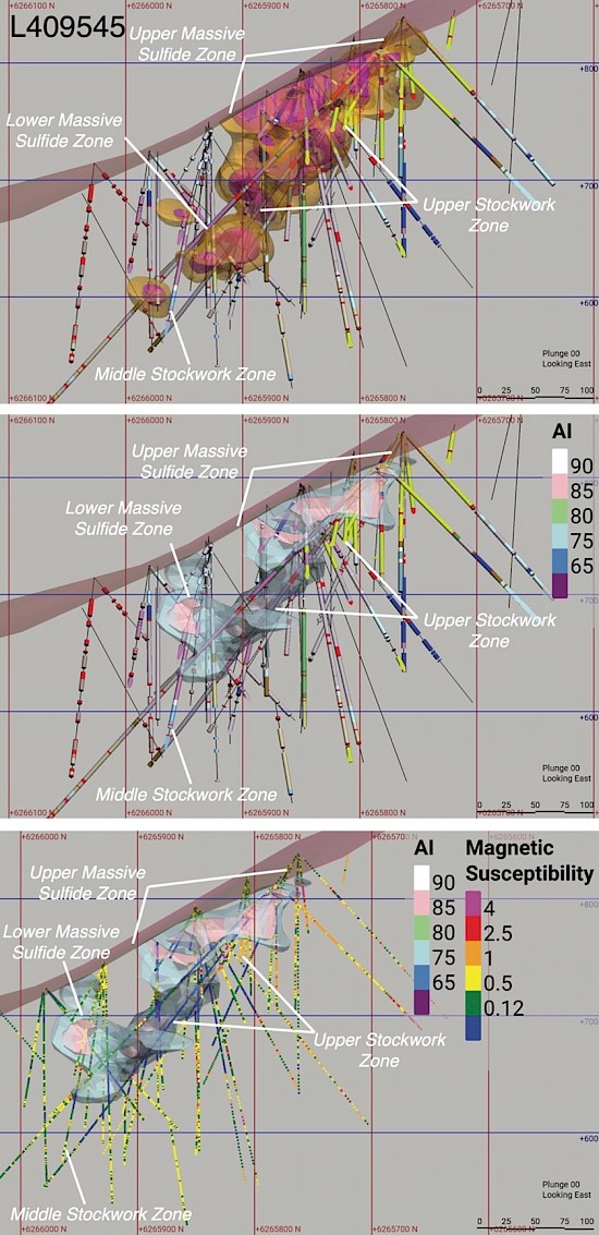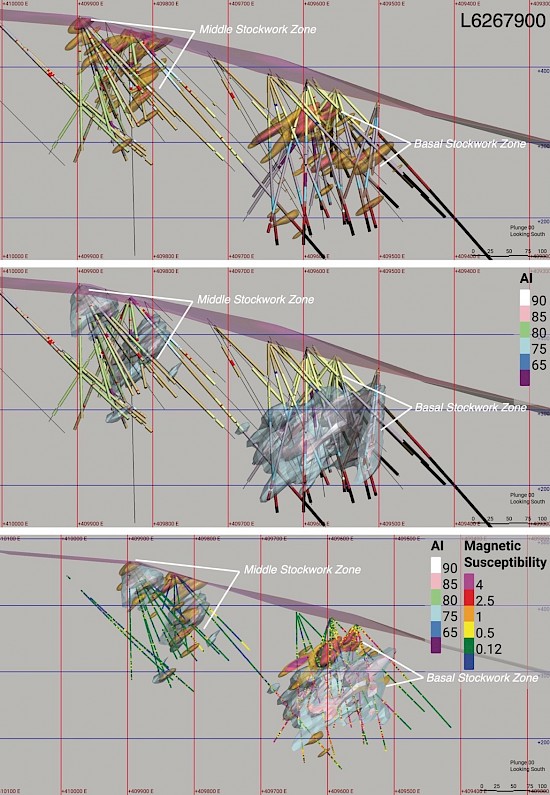 Figure 4: A 150 m thick long-section looking east centered on line 409545 E. The top figure shows modelled Au and Ag mineralized zones and down hole lithology (see Figure 9 for lithological legend). The middle figure shows down-hole lithology and zones of intense hydrothermal alteration as determined using the Ishikawa Alteration Index. The bottom figure shows down-hole magnetic susceptibility along with modelled zones of intense hydrothermal alteration. Intense hydrothermal alteration correlates with lower magnetic susceptibility at TV.