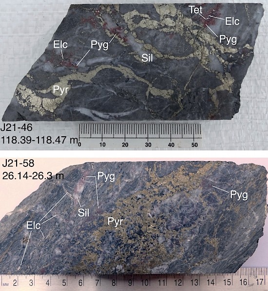 Figure 6: Massive sulfide mineralization from the Upper Massive Sulfide Zone at TV. Massive sulfide generally occurs with intensely silicified carbonaceous mudstone, and often occurs as sulfide breccia with additional sulfide infilling the breccia. Pyrargyrite is visible in the lower image, and is the predominate Ag-bearing mineral at TV.