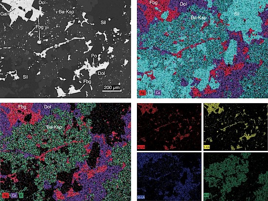 Figure 12: Backscattered electron images and energy dispersive X-ray spectroscopy elemental maps of sample J21-46 118.30 m, showing the Ag sulfarsenide minerals freibergite and pyrargyrite associated with dolomite, Ba-feldspar, and silica alteration.