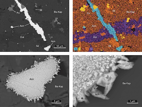 Figure 13: Backscattered electron images and energy dispersive X-ray spectroscopy elemental map of sample J21-46 118.30 m, showing the Ag sulfide mineral acanthite associated with dolomite and Ba-feldspar alteration.