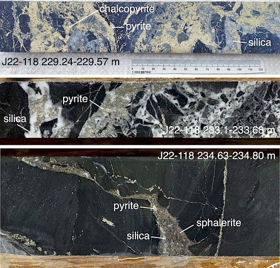 Drilling north of Jeff during 2022 showed that the stacked Jeff hydrothermal system extends ~700 northwards, and is predominately a base metal-rich sphalerite-dominated system with subordinate chalcopyrite (Figures 14 and 15). Precious metal mineralization is present at Jeff North, but is restricted to localized pods of sulfosalt minerals. Hydrothermal alteration is present but weakens north of Jeff. It is likely that the trend of VMS mineralization extending north of Jeff is connected to the Hexagon-Mercury target between Jeff North and Lulu.