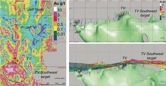 Figure 15: Magnetic tilt derivative map (left) and 1000 m thick long sections of the magnetic susceptibility model (right) for the TV-Jeff VMS trend. Long sections are centered around line 409500 E, with the upper one viewed looking due west, and the lower one viewed obliquely and from below the surface. Gold assay results for drill holes, and rock chip samples (circles) are shown. Zones of intense hydrothermal alteration (an Ishikawa alteration index greater than 80) are modeled as light blue volumes in the upper long section. As with Eskay Creek and Lulu, mineralization and hydrothermal alteration are closely associated with protrusions in the modeled magnetic susceptibility volume, with more pronounced protrusions correlating with stronger mineralization at TV and Jeff. The smaller protrusions in magnetic susceptibility between TV and Jeff correspond with zones of anomalous Au and Ag mineralization found with rock chip sampling and drilling. Prospective magnetic anomalism continues to the south and west of TV, supporting the interpretation of our geological team that sulfide mineralization at TV may extend in this direction based on encouraging results from drill holes TV22-108.