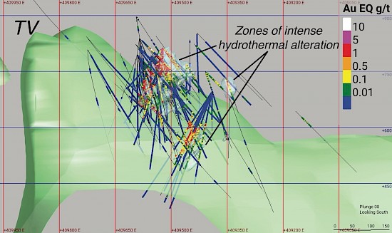 Figure 16: A 1000 m thick cross-section along line 6265700 N showing the magnetic susceptibility model for the TV VMS showing. Drill core assays in Au equivalent is shown. Zones of intense hydrothermal alteration (an Ishikawa alteration index greater than 80) are modeled in light blue. Mineralization and hydrothermal alteration lie right on the 0.001 SI magnetic susceptibility volume, as is the case with all other VMS systems on the Consolidated Eskay Property.