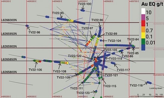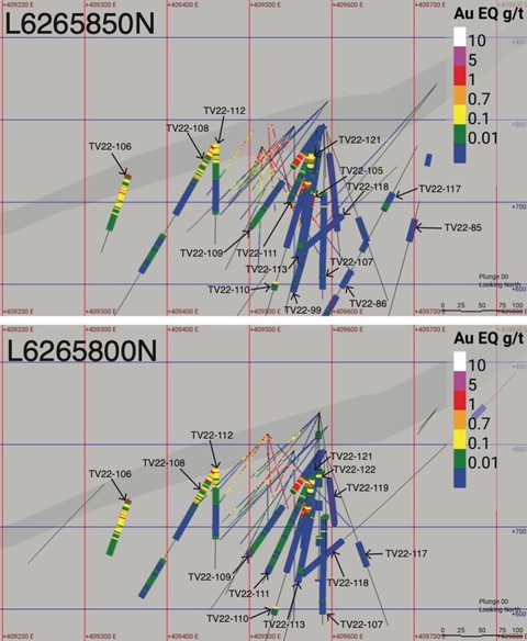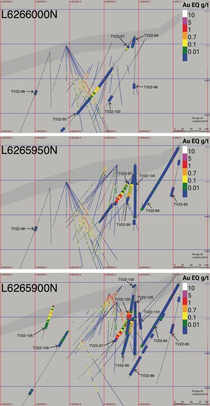 Figure 2: Map and cross-section views of TV showing drill hole assay results. Cross-sections are shown in the continuation of this figure below, and are 100 m thick along east-west lines spaced 50 meters apart. Assay results for 2022 drill holes are shown in bold, with results from 2020-2021 drilling shown as fine lines. Drill core assays are shown in g/t Au equivalent (Au+Ag/78). Drilling in 2022 expanded the footprint of the Upper Massive Sulfide Zone northwards and down-dip with respect to 2020-2021 drilling, giving this zone minimum dimensions of ~100 m along strike, ~150 m down-dip to the east, and a true thickness of ~ 5-10 m. The footprint of the Stockwork Zone was expanded down-dip to the east, and up-dip to the west with respect to 2020-2021 drill holes, giving this zone dimensions of ~175 m along strike, 170 m down-dip, and a true thickness ranging from ~50-100 m. Recent and legacy rock chip sample results suggest that the up-dip part of the Stockwork Zone may contain high-grade pockets of Au and Ag mineralization within a zone of strongly anomalous Au and Ag mineralization.
