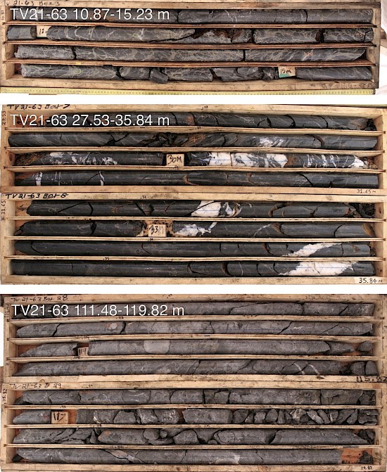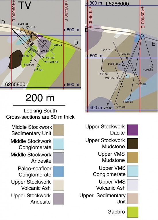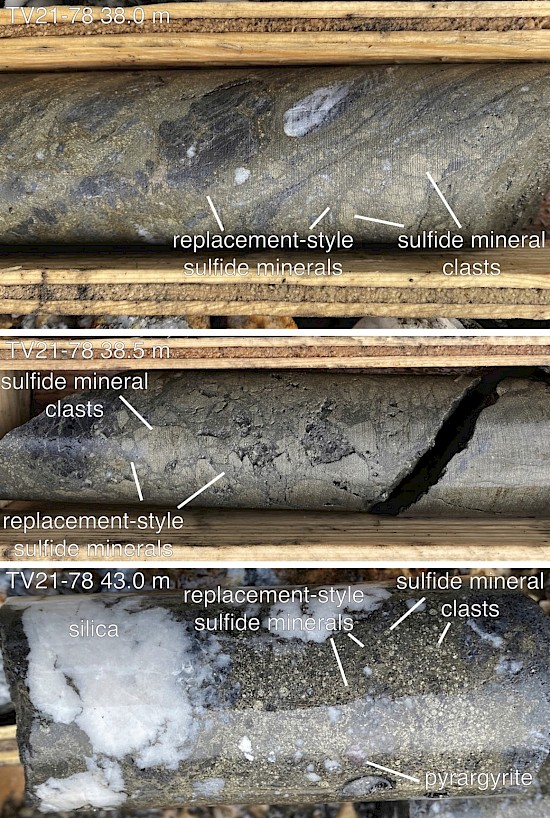 Drilling at TV in 2022 expanded the footprint of both the Upper Massive Sulfide Zone and Stockwork Zone at TV (Figure 2). Massive sulfide mineralization extends approximately 100 m along strike ranging from 5-10 m in thickness, and is characterized by sulfide lenses (Figure 6) hosted by intensely silicified carbonaceous mudstone associated with peperitic dacite (Figure 3-5). Massive and semi-massive sulfide mineralization overlies an extensive stockwork feeder zone hosted by dacitic and andesitic breccia and peperite. Stockwork mineralization extends ~175 m along strike, ~175 m down dip, and ranges in thickness from ~50-100 m. Significantly, drill holes testing the up-dip extent of the stockwork zone (TV22-106, 108, and 112) intercepted strongly anomalous Au and Ag values with interspersed values over 1 g/t Au equivalent. High-grade rock chip samples surrounding these drill holes and extending eastward towards drill holes TV22-106 and TV22-108 suggests that this up-dip zone may contain higher grade pockets of Au and Ag mineralization. Drilling in 2020 and 2021 discovered the Lower Zone of Au- and Ag-bearing massive sulfide mineralization at TV (Figure 4). The Lower Zone at TV is hosted by andesite, interpreted to be the stratigraphic equivalent of the host andesite in the Upper Zone at Jeff. Mineralization at TV is associated with intense hydrothermal alteration (Figures 4 and 5), confirming that mineralization at TV is focused on a syn-volcanic VMS feeder structure.