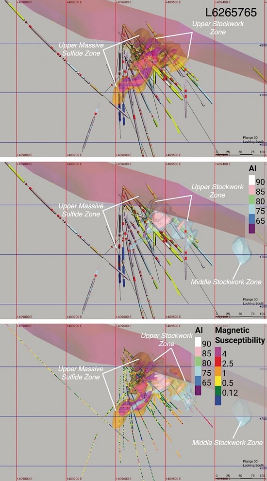Figure 5: A 150 m thick cross-section of the TV showing looking south, centered on line 6265765 N. The top figure shows down-hole lithologies (see Figure n for lithological legend), and modelled Au- and Ag- mineralized zones. The middle figure shows down-hole lithology and modelled zones of intense hydrothermal alteration as determined using the Ishikawa Alteration Index. The bottom figure shows down-hole magnetic susceptibility along with modelled zones of Au- and Ag- mineralization and intense hydrothermal alteration. Intense hydrothermal alteration correlates with lower magnetic susceptibility at TV.