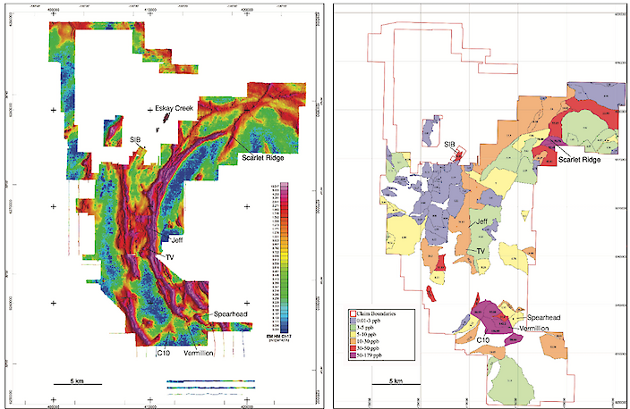 (Figure 1: Plan view of the Consolidated Eskay property showing results from the 2021 SkyTEM survey (left) and the 2020 BLEG survey (right). The locations of deposits and prospects, including TV are shown on both maps.)