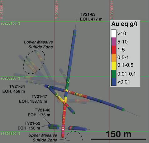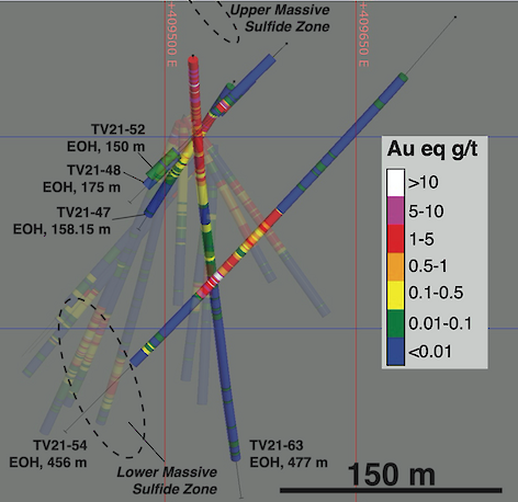 “We are thrilled with recent diamond drill results from the stockwork zone at the TV deposit,” commented Dr. Quinton Hennigh, technical advisor and director of Eskay Mining. “These first five holes indicate there is a large stockwork feeder under the upper massive sulfide deposit discovered in drilling late in the season. The 92.3m intercept grading 2.7 gpt Au eq in hole TV21-54 is thought to represent the true thickness of this large system, open along strike and down dip. We will be anxious to see return of further assays from the TV stockwork, the upper and lower massive sulfide horizons, as well as the other VMS systems drilled by Eskay this season. These results are a great start.”