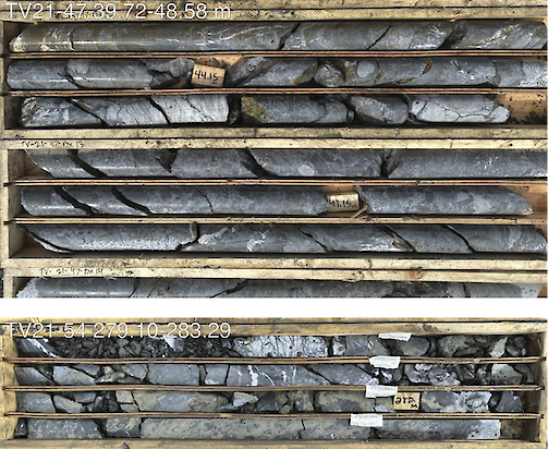 (Figure 4: Stringer style sulfide and sulfosalt mineralization at TV: TV21-47 39.72-48.58 m showing mineralization within andesite breccia; and TV21-54 279.10-283.29 m showing intense mineralization hosted by silicified mudstone.)