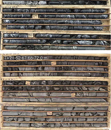 (Figure 5: Stringer style sulfide and sulfosalt mineralization at TV: TV21-48 65.63-72.5 m and TV21-52 67.68-72.0 m showing mineralization hosted by intensely silicified mudstone.)