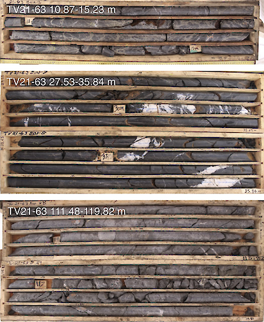 (Figure 6: Stringer style sulfide and sulfosalt mineralization at TV: TV21-63 10.87-15.23 m and TV21-63 27.53-35.84 m showing mineralization hosted by intensely silicified mudstone; and TV21-63 111.48-119.82 moderate mineralization hosted by silicified dacite breccia.)